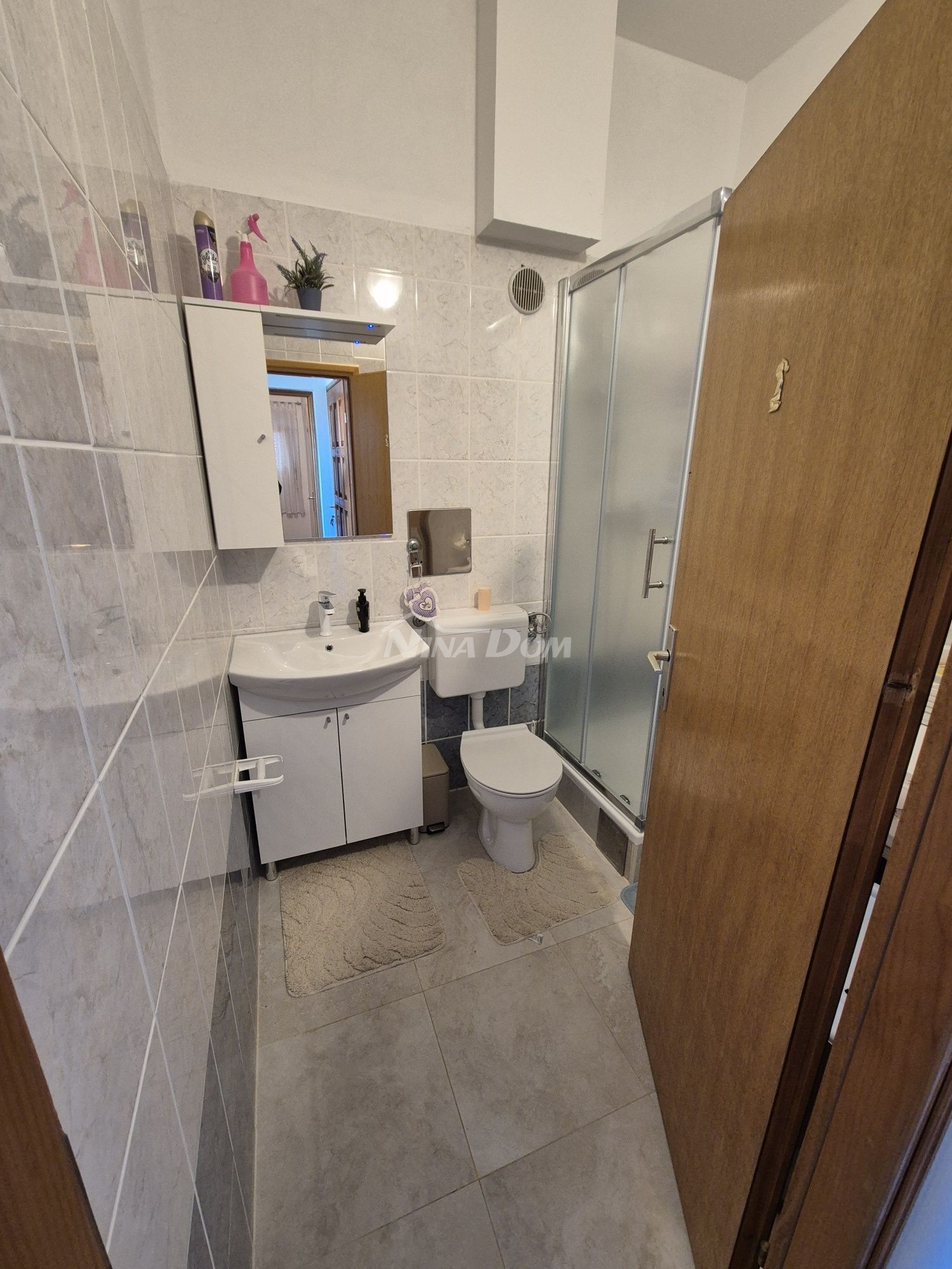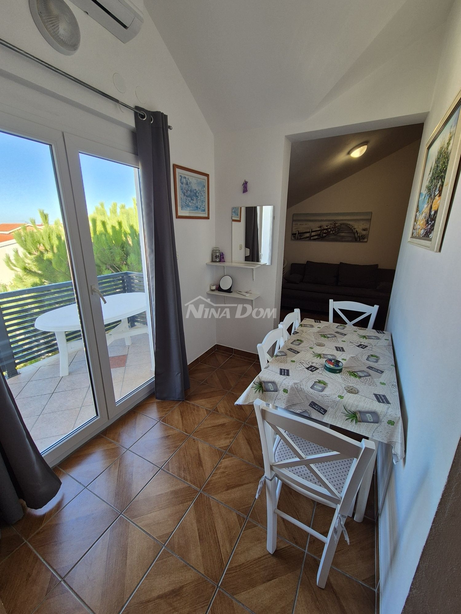 The apartment is located on the second floor and consists of a hallway, kitchen with dining room and living room, balcony, bathroom and one bedroom, with a usable area of 38.38 m2. The apartment also has a parking space of 12.50 m2. The water tank with a water meter, the connection to the electricity network is shared by all tenants (consumption control meter). The building is well maintained, 180 meters from the sea and beach.