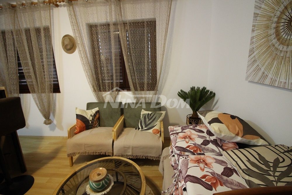 Samostojeća nekretnina koja se sastoji od prizemlja i kata s lijepom okućnicom. Prizemlje: terasa, kuhinja s dnevnim boravkom i blagovaonicom, tri spavaće sobe, kupaona i ostava ispod stepenica. Kat: vanjske stepenice, hodnik, kuhinja s blagovaonicom i dnevnim boravkom, kupaona, spavaća soba, (jedna soba koja nije uređena, trenutno služi kao ostava) terasa. Klimatizirana, spojena na gradski vodovod i kanalizaciju, okućnica zelena,Od mora i lijepe plaže udaljena je 400 metara. (na plaži trgovina koja radi cijelu godinu, restorani i plažni kafići).