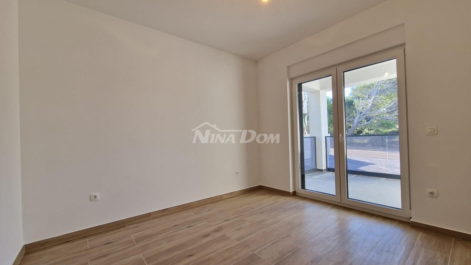 Novostavba v krásnej a tichej lokalite. Prízemie: pozostáva z chodby, kuchyne s jedálňou a obývačkou, dvoch spální, kúpeľne a dvoch terás. Celková plocha samostatnej časti bytového domu na prízemí je 89,67 m2. K bytovému domu patrí aj pozemok o výmere 38,33 m2 a parkovacie miesto o výmere 12,64 m2. Je vzdialený 260 metrov od mora a pláže v Prezide. Krásny výhľad na more a Velebit. Klimatizované, napojené na mestský vodovod a kanalizáciu.